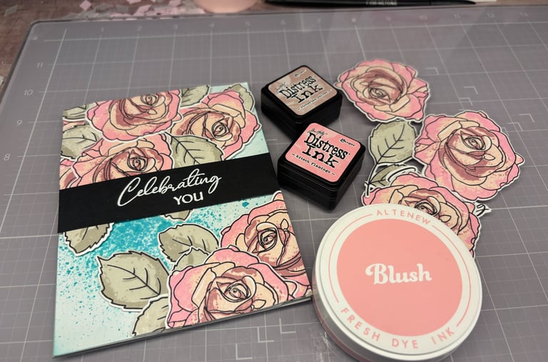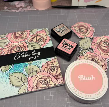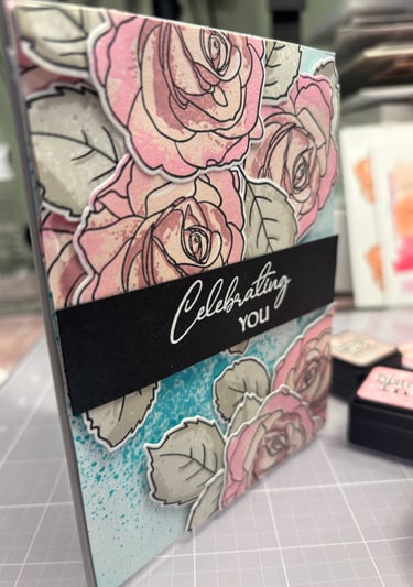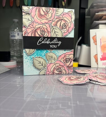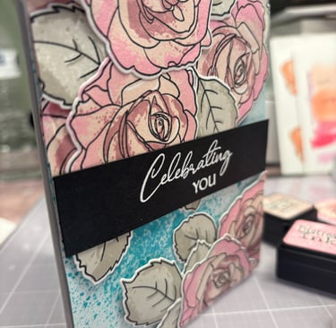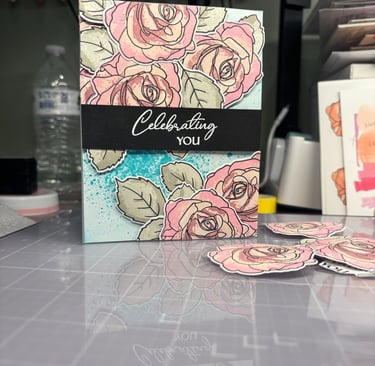 I stamped the images using the stamping guide provided. First stamping the roses then the leaves. This stamp set also came with the coordinating die set that cut out the rose and the leaves. I used my favorite die cutting tip. I cut out the rose and leaves on a contrasting color scrap card stock to use as a guide. I look my stamped rose image and placed the die negative over top and by doing this you are able to position the die evenly around and it cuts it out perfectly every time. I wasn't crazy about the white card panel so I ink blended with a turquoise ink and then ink splattered with peacock feathers distress spray. I then arranged the images on the upper left corner and the lower right corner in a triangle arrangement pattern. I taped the images together and turned the card over and applied foam tape. This gives my floral arrangement dimension. I then turned the card over and trimmed the excess hanging over. I placed some of the leaves that were trimmed back on the card panel to fill in the blank areas. I adhered the card panel to gray card stock I had in my stash.