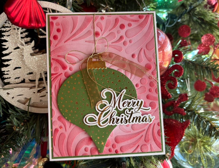 I again used her new cranberry ink colors. I used some printed paper from Lawn Fawn called all that sparkles to cut out the ornament. the ornament hanger was from gold cardstock i had in my stash. I embossed my panel using the embossing folder and took my ink pad directly to the paper and shaded the background. I used gold cord and ribbon purchased from SSS. The sentiment is a new technique for me. I used Gina K Designs poly glaze sheets, gold foil sheets and the fuse machine. Check out Gina's youtube she has lots of videos that she demos this technique. I popped uo the ornament with foam tape. Leave me a comment on which cards is your favorite. Below are the other cards I made using rub ons from Scrapbook.com!